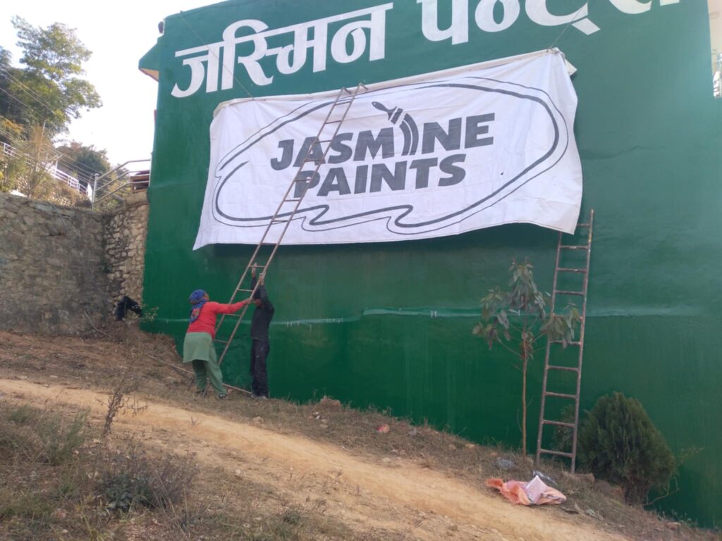यतिबेला अर्घाखाँचीकाे सन्धिखर्क स्थित ठूलाठूला घरका भित्ताहरूमा हरियाेपृष्ठमा जस्मिन पेन्टस् लेखिएका सेता अक्षर टल्किरहेका छन् ।