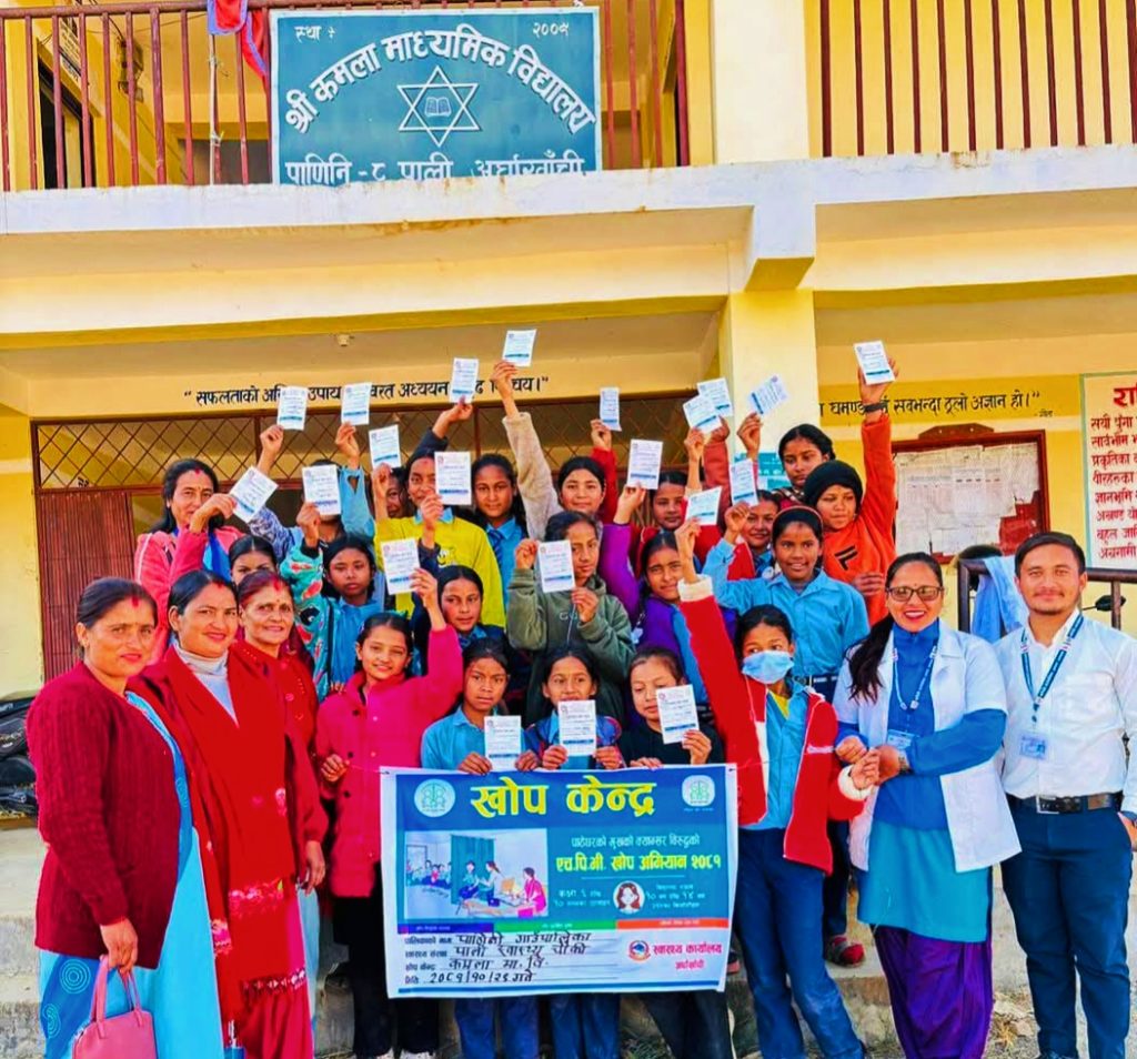 अर्घाखाँची– स्कुल पढ्ने १० देखि १४ वर्ष उमेर समुहका विद्यार्थीलाई स्वास्थ्य कार्यालय अर्घाखाँचीले गाउँगाउँमा खोप लगाएको छ । कक्षा ६ देखि १० कक्षासम्मका ७ हजार ५ सय ४७ जना विद्यार्थीलाई पाठेघरको मुखको क्यान्सर रोकथामको लागि किशोरीलाई खोप दिइएको स्वास्थ्य कार्यालय प्रमुख शिव नेपालीले बताउनुभयो ।