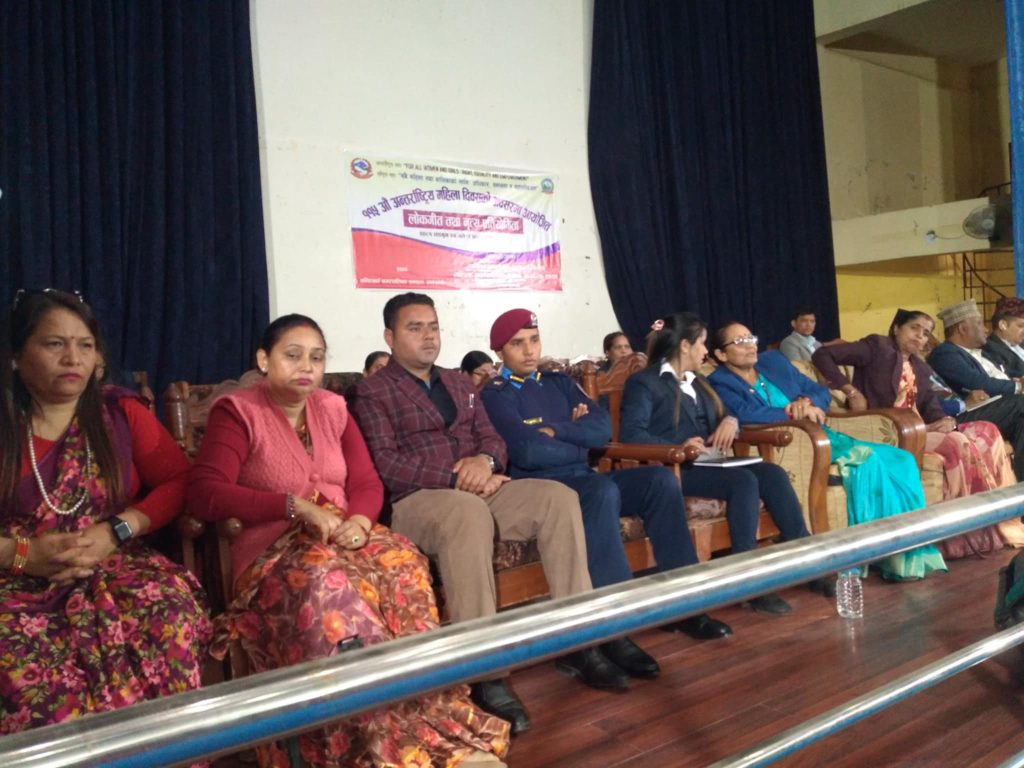 नगरपालिका उप प्रमुख मिश्रा आचार्यकाे अध्यक्षतामामा सम्पन्न कार्यक्रममा प्रमुख अतिथि जिल्ला समन्वय समिति प्रमुख जीव नारायण काेईरालाले शुभकामना मन्तव्य राख्दै हामी सबै दिन दुखि महिला दिदिबहिनिहरूकाे सहयाेग र सेवामा जुट्न सके र उनिहरूकाे दयनिय अवस्था फेर्न सकेमा मात्र नारी दिवस मनाएकाे सार्थकता हुने बताउनु भयाे ।