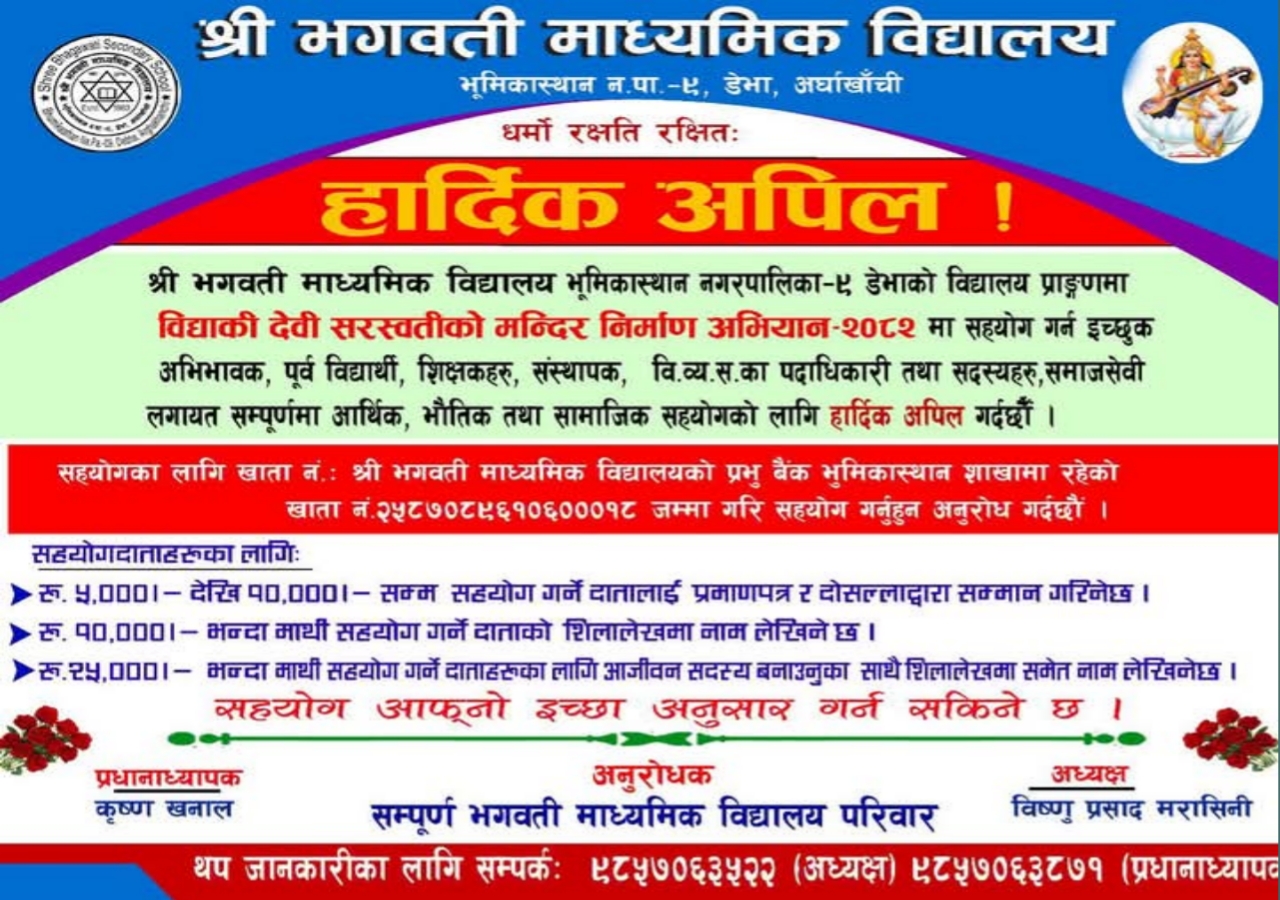 श्री भगवती माध्यमिक विद्यालय भूमिकास्थान न.पा.-९, डेभाले विद्यालय परिसरमा सरस्वती मन्दिरको निर्माणका लागि आम समुदायमा आर्थिक सहयोगको अपील गरेको हो ।