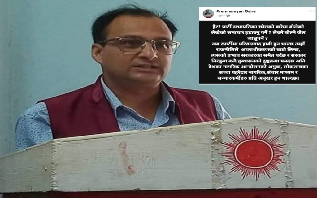 “हैट! पार्टी सभापतिका छोराको बारेमा बोलेको लेखेको समाचार हटाउनु पर्ने ? लेख्ने बोल्ने जेल जान्नुपर्ने ?