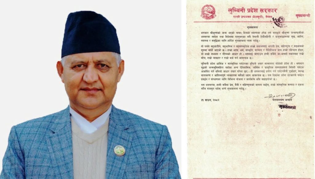 श्रीकृष्ण जन्माष्टमीको अवसरमा शुभकामना व्यक्त गर्दै मुख्यमन्त्री आचार्यले भगवान बुद्धको जन्मभूमि लुम्बिनी मात्र नभई प्रदेशभित्रका अन्य ऐतिहासिक, धार्मिक र प्राकृतिक सम्पदाले समेत विदेशी पर्यटकलाई आकर्षित गर्ने बलियो आधार तयार गरेको बताए ।