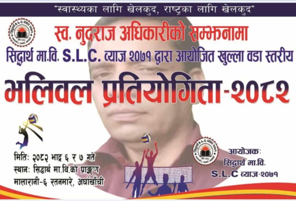 अर्घाखाँची – “स्वास्थ्यका लागि खेलकुद, राष्ट्रका लागि खेलकुद” भन्ने मुलनाराका साथ स्व. नुदराज अधिकारीको सम्झनामा सिद्धार्थ मा.वि. S.L.C. व्याज–२०७१ द्वारा आयोजित खुला वडा स्तरीय भलिवल प्रतियोगिता–२०८२ हुने भएको छ ।