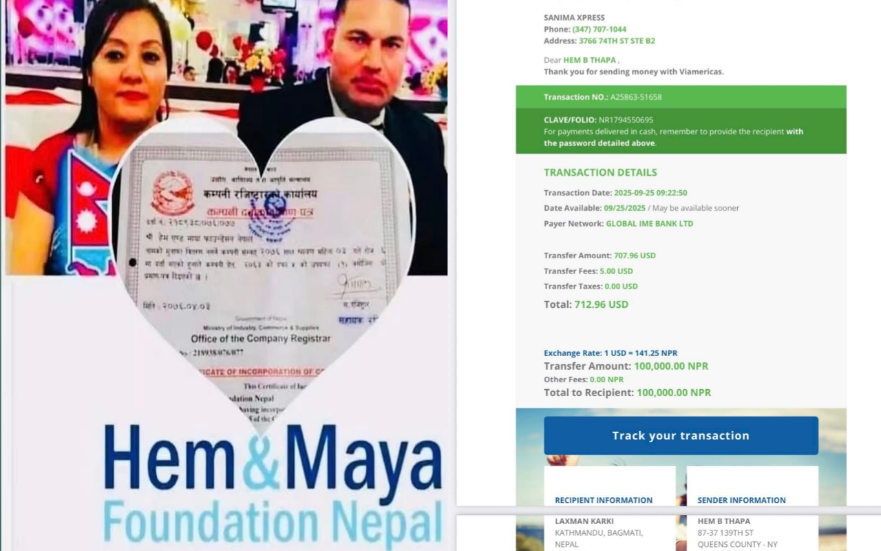 सहयोगका लागि घोषणा गरिएको उक्त रकम समझना कार्की (बीहिनी) र लक्ष्मण कार्की (भाइ) मार्फत हस्तान्तरण गरिएको हो। थापाले परिवारका सदस्यहरूको साथ र प्रोत्साहनकै कारण निरन्तर समाजसेवामा लाग्न सहज भएको उल्लेख गर्दै भविष्यमा अझै व्यापक रुपले सहयोग विस्तार गर्ने प्रतिवद्धता जनाएका छन्।