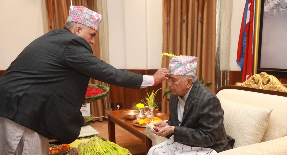 काठमाडौं – विजयादशमीको अवसरमा राष्ट्रपति रामचन्द्र पौडेलले आज शीतल निवासमा टीका ग्रहण गरेका छन्। पुरोहित अर्जुन अधिकारी र देवराज अर्यालले बिहान ११:५३ बजे शुभ साइतमा राष्ट्रपति पौडेललाई टीका लगाइदिएका हुन्।