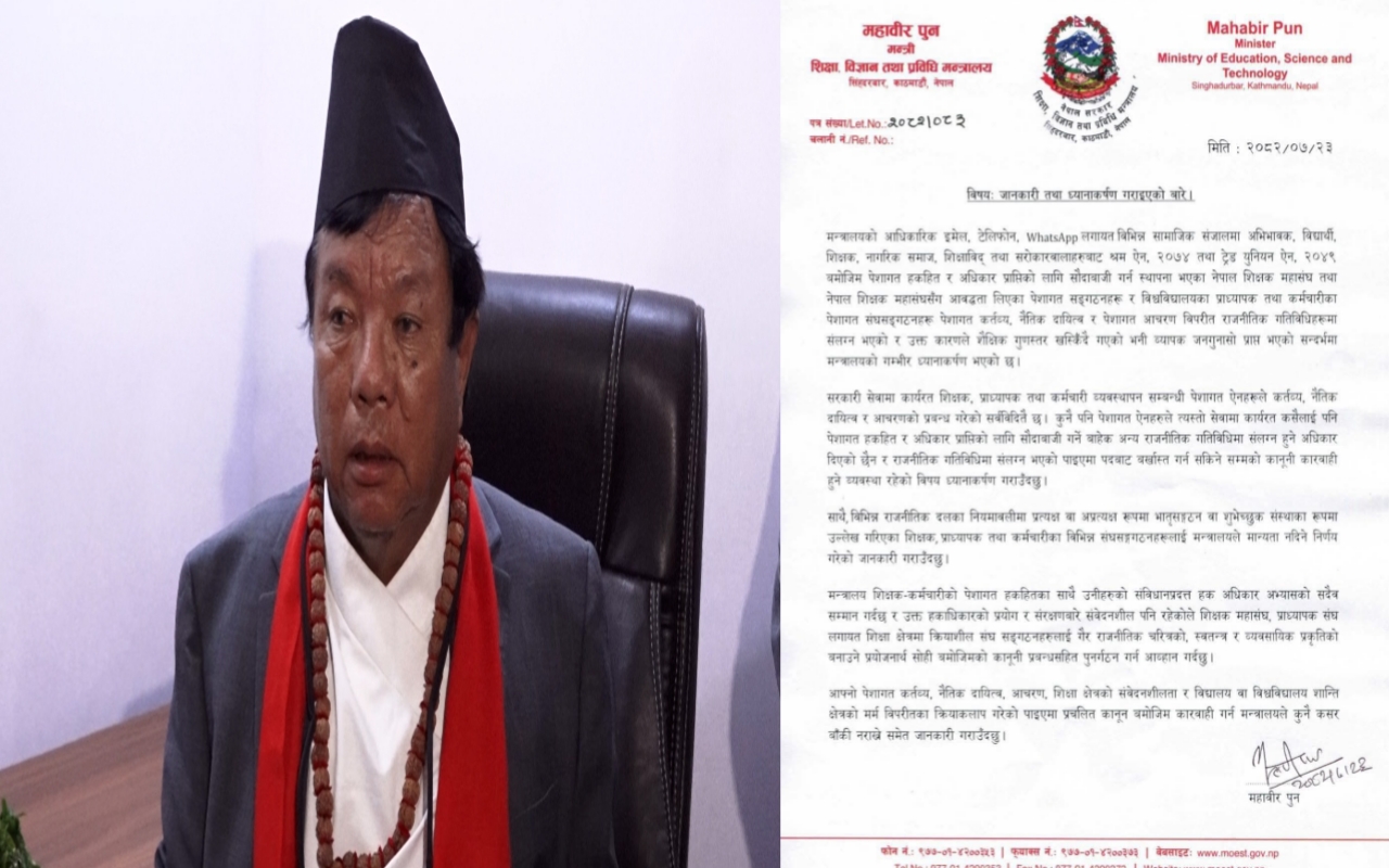 शिक्षा, विज्ञान तथा प्रविधि मन्त्री महावीर पुनले आइतबार जारी गरेको विज्ञप्तिमा मन्त्रालयले कुनै पनि राजनीतिक दलका भ्रातृ संगठन वा शुभेच्छुक संस्थामा संलग्न शिक्षक, प्राध्यापक र कर्मचारीका समूहलाई अबदेखि मान्यता नदिने जनाएको छ।