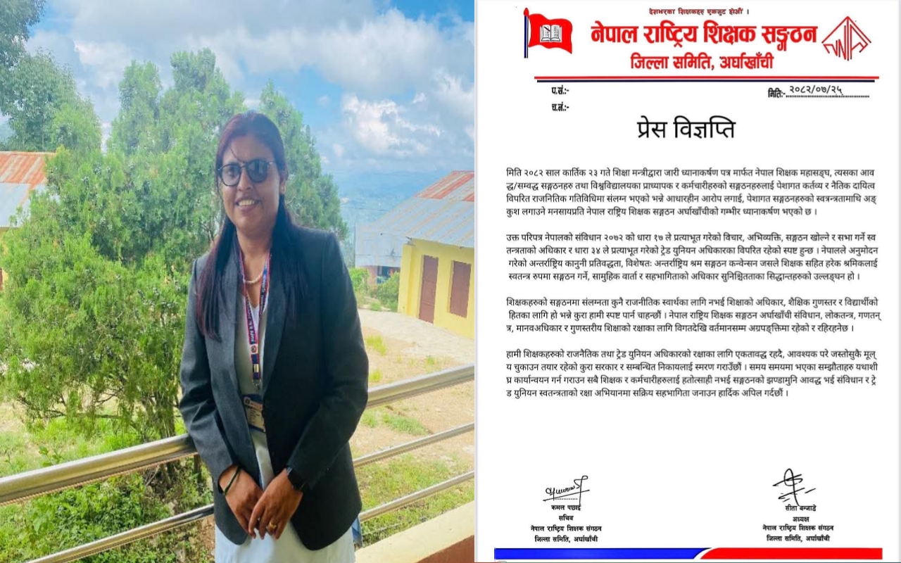 अर्घाखाँची । नेपाल राष्ट्रिय शिक्षक संगठन जिल्ला समिति, अर्घाखाँचीले शिक्षक अधिकारमाथि अंकुश लगाउने सरकारको प्रयासको कडा विरोध गर्दै प्रेस विज्ञप्ति सार्वजनिक गरेको छ।