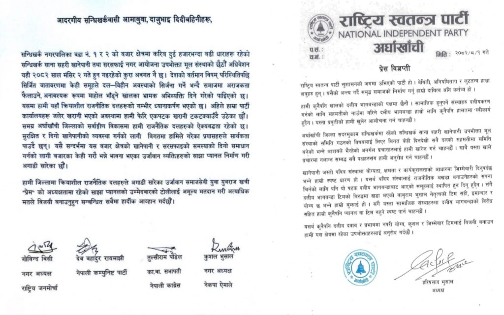 दलहरूले अपिलमा राजनीतिक मुख्यालयहरू जलेर नष्ट भएका समयमा पनि सहकार्यकै बलमा स्थानीय संरचनाहरू उभ्याएको उदाहरण दिँदै अब स्थायी र सुरक्षित खानेपानी प्रणालीका लागि उर्जावान नेतृत्व अपरिहार्य भएको बताएका छन्।