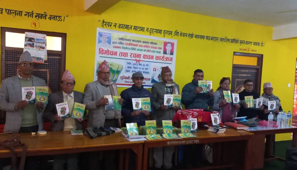 पौष २५ , अर्घाखाँची। लुम्बिनी वाङ्मय प्रतिष्ठान जिल्ला कार्य समिति अर्घाखाँचीको आयोजनामा साहित्यकार नारायण खनाल (नीलम) को कविता सङ्ग्रह जिजीविषाको लय र गजलकार डिल्लीराज घिमिरे (सङ्गम) को गजल सङ्ग्रह भँगेरी को संयुक्त विमोचन सम्पन्न भएको छ।