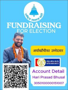 अर्घाखाँची । राष्ट्रिय स्वतन्त्र पार्टी (रास्वपा) अर्घाखाँचीका उम्मेदवार हरि प्रसाद भुसालले चन्दा संकलनमार्फत चुनावी खर्च जुटाउने अभियान सुरु गरेका छन्। पारदर्शिता र न्यूनतम खर्चलाई प्राथमिकता दिँदै उनले जनसहभागितामा आधारित चुनावी अभियान अघि बढाउने बताएका हुन् ।