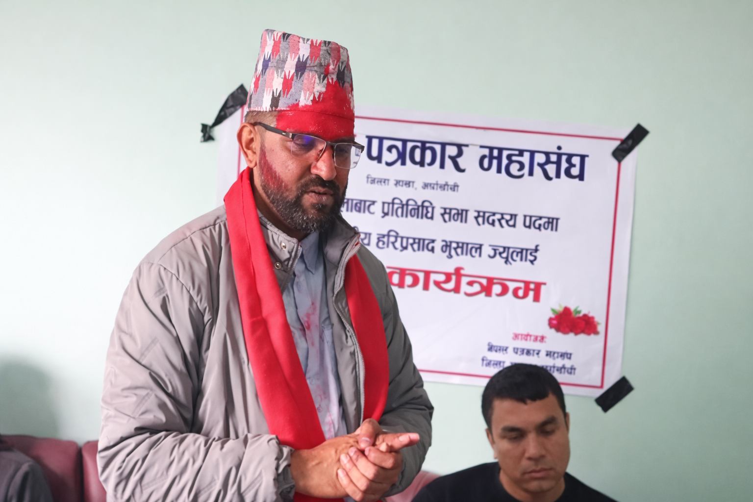 अर्घाखाँची । नेपाल पत्रकार महासंघ अर्घाखाँची शाखाले नवनिर्वाचित प्रतिनिधिसभा सदस्य हरि प्रसाद भुसाललाई सम्मान गरेको छ। जिल्लामा आयोजित कार्यक्रममा महासंघले सांसद भुसालको योगदान र सञ्चार क्षेत्रमा सहकार्यमा देखाएको इच्छालाई सम्मान स्वरूप प्रस्तुत गरेको हो।