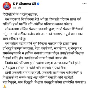 नेकपा एमालेका अध्यक्ष ओलीले सामाजिक सञ्जालमार्फत सन्देश जारी गर्दै लोकतन्त्रमा अन्तिम निर्णय जनताकै हुने भएकाले त्यसलाई शिरोधार्य गर्नु आफ्नो र पार्टीको कर्तव्य भएको बताएका हुन्।