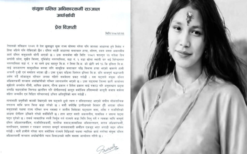 अर्घाखाँची । संयुक्त दलित अधिकारकर्मी सञ्जाल अर्घाखाँचीले प्रेस विज्ञप्ति जारी गर्दै सुर्खेतमा मृत भेटिएकी १६ वर्षीया इनिशा बि.क.को घटनामा निष्पक्ष छानबिन गरी दोषीलाई कडा कानुनी कारबाही गर्न माग गरेको छ।