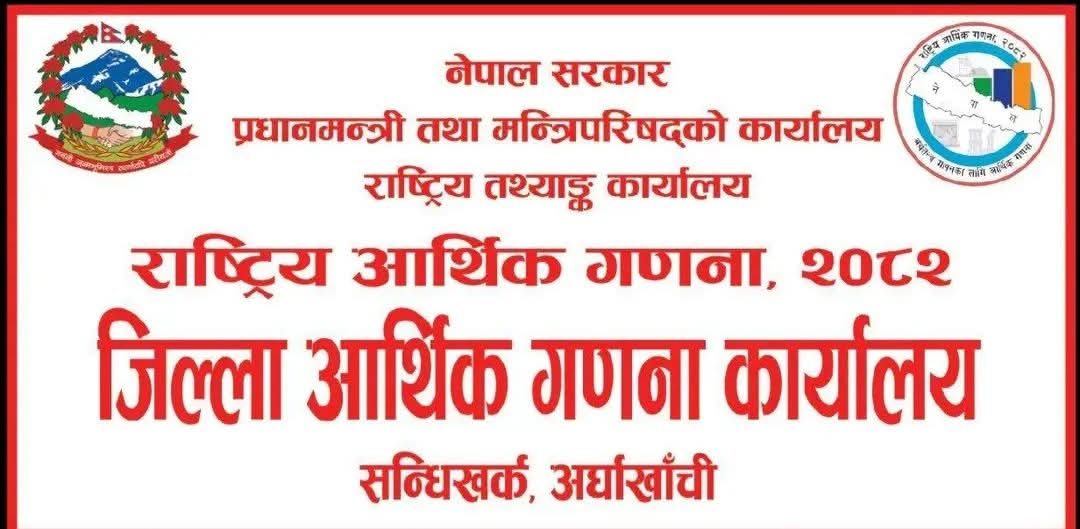 यही मिति २०८३ वैशाख २ गतेदेखि असार ७ गतेसम्म जिल्ला अािर्थक गणना कार्यालय अर्घाखाँचीबाट खटिएका गणकहरु तपाइको उद्योग, पसल, व्यवसाय, विद्यालय वा कार्यालय, सबै प्रकारका संघ, संगठन, संस्था, प्रतिष्ठान, व्यवसायहरुमा आउँदैछन् । आफ्ना व्यवसायीक क्रियाकलापको सही विवरण दिएर सहयोग गरौं । तपाइको विवरण तथ्यांक ऐन, २०७९ अनुसार गोप्य रहनेछ ।
