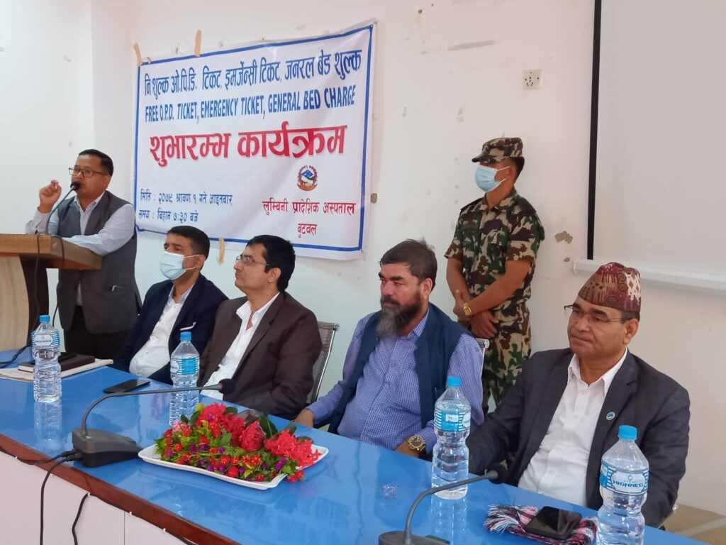 मुख्यमन्त्री कुलप्रसाद केसीले निःशुल्क सेवाको शुभारम्भ गर्दै लुम्बिनी प्रदेश सरकारले जनताको स्वास्थ्यमा पहुँच स्थापित गर्ने उद्देश्यका साथ काम गरिरहेको बताए । प्रदेश सरकारले मातहत रहेका यी दुई अस्पतालमा ओपिडी र इमर्जेन्सी टिकट तथा जनरल बेड निःशुल्क गर्ने घोषण गर्दै चालु बर्षको बजेटमा एक करोड ५० लाख रुपैयाँ बिनियोजन गरेको थियो । प्रदेश सरकारले बजेटमा घोषणा गरेबमोजिम प्रादेशिक अस्पतालमा उपचारका लागि आउने बिरामीहरुलाई ओपिडी र इमर्जेन्सीको टिकट तथा तथा जनरल बेडमा अव देखि कुनैपनि शुल्क नलाग्ने लुम्बिनी प्रादेशिक अस्पतालका प्रमुख मेडिकल सुपेरिटेण्डेन्ट डा. इन्द्र ढकालले जानकारी दिए ।