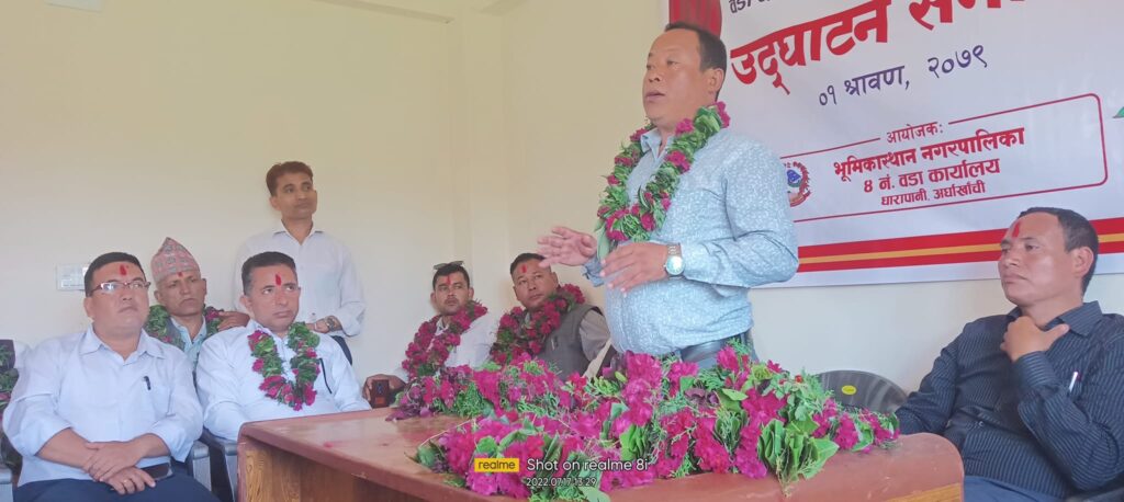 भुमिकास्थान–४ को नवनिर्मित वडा कार्यालय भवन उद्घघाटन गर्दै नगर प्रमुख थापाले आगामी आर्थिक बर्षका योजना सुनाउदै शिक्षा, स्वास्थ, कृषि र पर्यटनलाई विकासको आधार मानेर अगाडी बढ्ने भन्दै उनले १० वटै वडामा घुम्ती स्वास्थ शिविर चलाउने बताए । नगरपालिकामा मुस्कान सहितको सेवालाई चुस्त ढंगले कार्यान्वयन गर्न नगरप्रमुख थापाले बताए ।