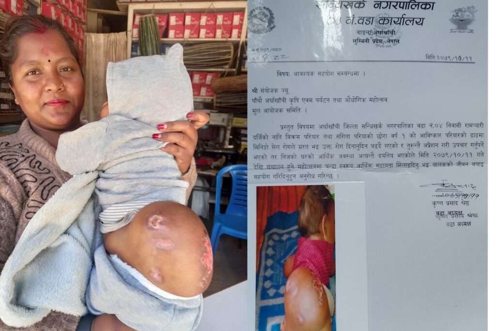 सन्धिखर्क नगरपालिका–४ देउरालीडाडा निवासी राम प्यारी दमाईको नाति विक्रम परियार तथा संगिता परियारको छोरा १ वर्षीय आविष्कार परियारको उपचारका लागि परिवारले सहयोगको अपिल गरेका हुन ।