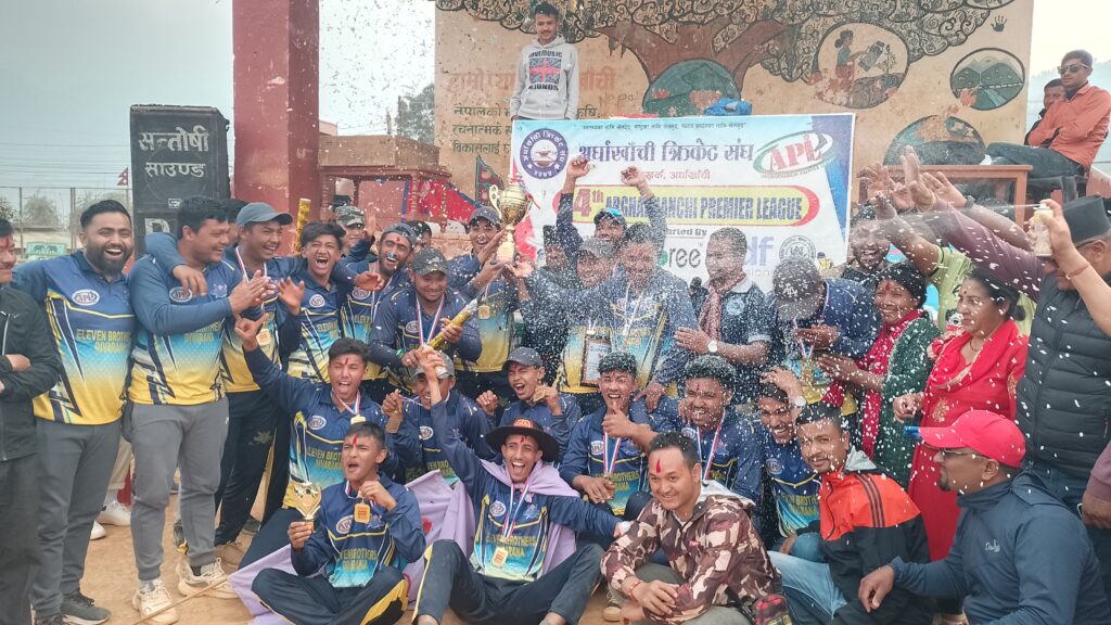 अर्घाखाँची क्रिकेट संघको आयोजना चौथो अर्घाखाँची प्रीमियर लिग टि-२० क्रिकेट प्रतियोगिता सन्धिखर्कमा मंगलबार सम्पन्न गरेको हो । आठौं दिन राेयल सन्धिखर्क लाई ८७ रनले पराजित गर्दै इलाभेन ब्रदर्श डिभर्ना १२१ रन लिएर प्रथम भएको हो । क्रिकेट प्रतियोगितामा पुष्प वारीयर्स टिमका खेलाडी सागर चौहान १४७ रन लिएर बेस्ट ब्याटमेन भएका हुन । यस्तै रोयल सन्धिखर्क टिमका विजय भट्टराई १४ विकेट लिएर बेस्ट बलर भएका थिए । चार टिम मध्य प्रथम इलाभेन ब्रदर्श डिभर्ना र दोस्रो रोयल सन्धिखर्क टिम भएको हो ।