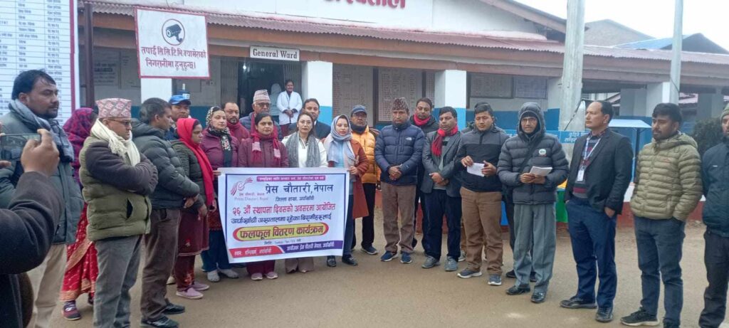 प्रेस चौतारी नेपालको २६ औं स्थापना दिवसको अवसरमा प्रेस चौतारी जिल्ला शाखाले सोमबार अर्घाखाँची अस्पतालमा भर्ना भएका ३७ जना बिमारीहरु लाई स्याउ, सुन्तला, बिस्कुट ,फ्रुटी, केरा लगायत फलफूल वितरण गरि मनाएको हो ।