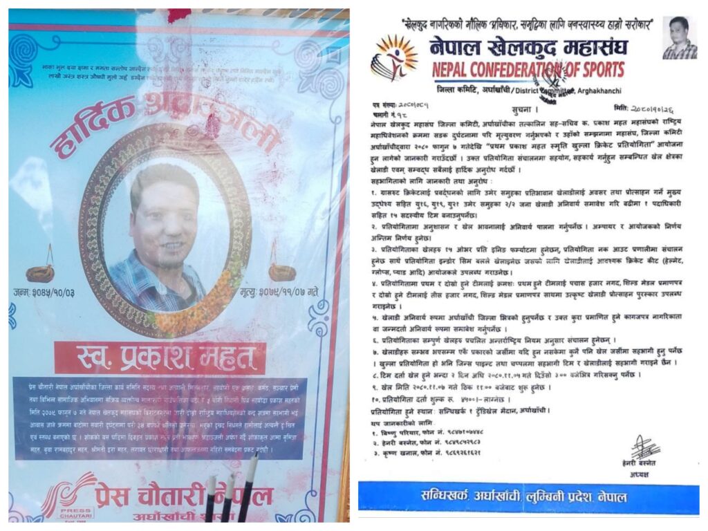 नेपाल खेलकुद महासंघ अर्घाखाँचीद्वारा २०८० फागुन ७ गतेदेखि “प्रथम प्रकाश महत स्मृति खुल्ला क्रिकेट प्रतियोगिता” हुने भएको छ ।